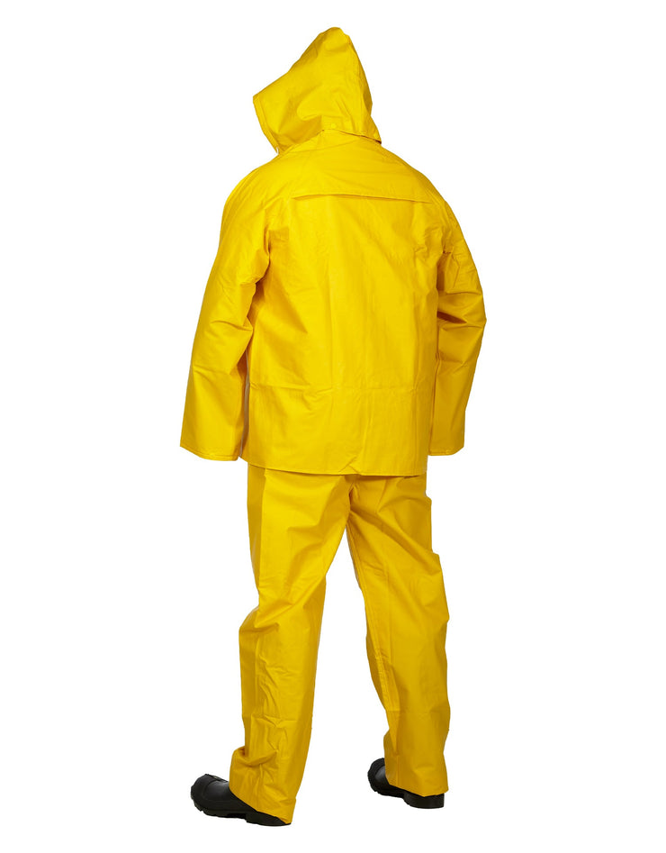 This 3-Piece Yellow PVC Rainsuit features a fire-resistant coating, ensuring wind and waterproof protection. The jacket includes a vented back and detachable snap hood, while the bib pants offer adjustable shoulder straps, a comfortable seat cut, and a snap fly. Meets CGSB standard 155.20.2000 for flame resistance. CFIA accepted for food contact use.