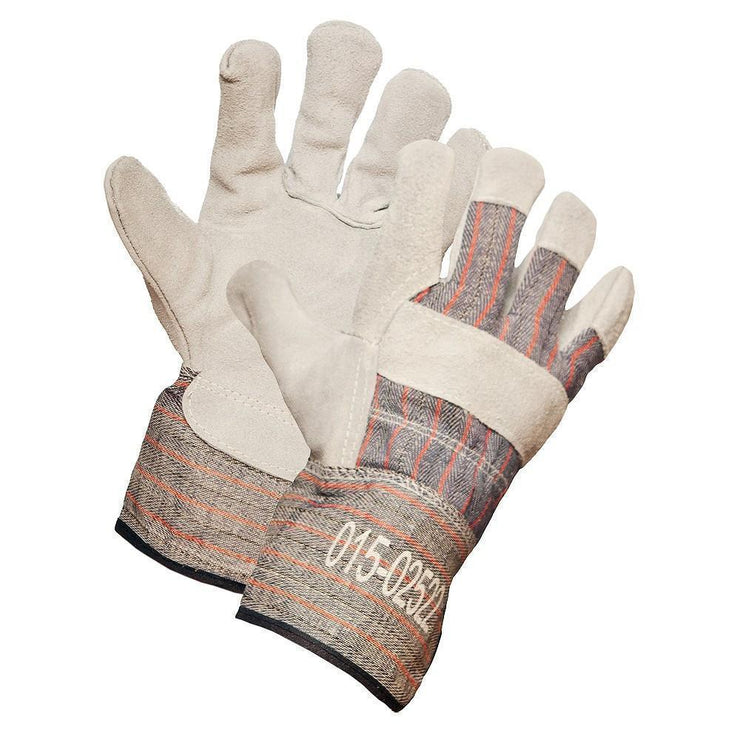 The Split Leather Work Gloves with Extended Cuff feature a standard grade split leather palm and an extra-long 5" cuff, providing enhanced wrist and forearm protection against nicks and abrasions. The polyethylene-coated safety cuff ensures durability and maintains integrity through laundering.