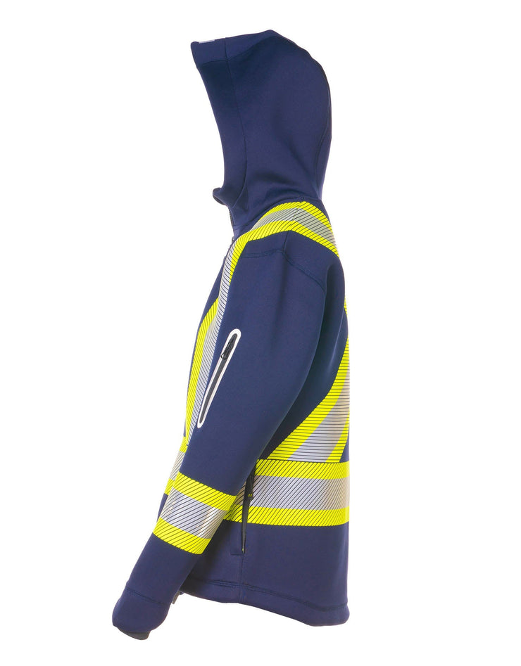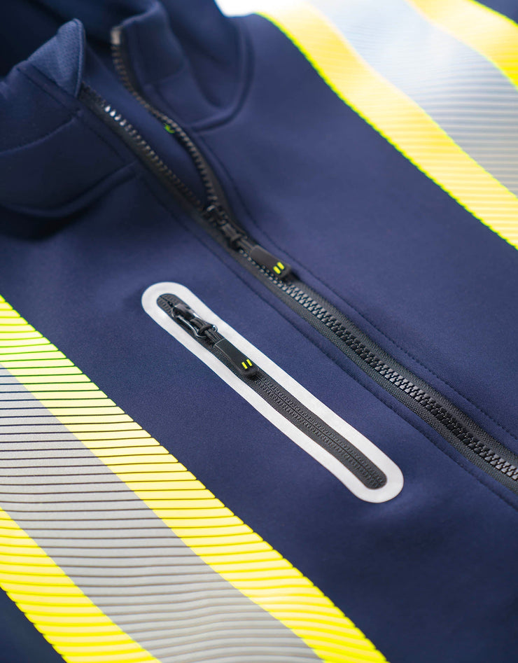 Experience unparalleled comfort and safety with our deluxe 400 g/m2 polyester fleece. Featuring a high-neck style, zippered chest pocket, and front closure, it's designed for flexibility with segmented reflective tape. Includes two waist pockets, angled wrist sleeves, and meets CSA Z96-22 standards, with the navy option at Class 1 Level 2.
