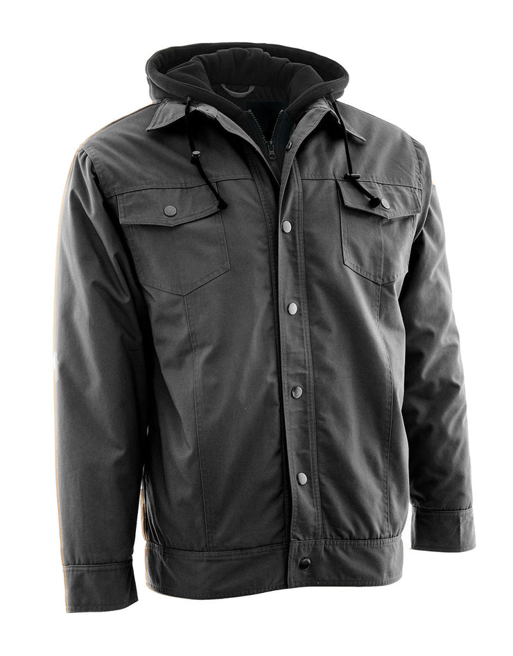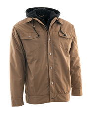 Embrace rugged style and functionality with our Canvas Jacket, featuring a jersey knit fooler hoodie, double hood with drawstring, snap-button storm flap, chest and hand pockets, and adjustable snap cuffs for a perfect fit.